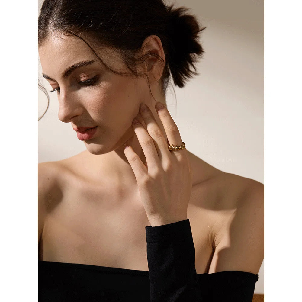 En unik ring med en design som påminner om tänder, där varje detalj fångar en kraftfull och modern estetik. Ringens strukturerade form skapar en dramatisk och iögonfallande look, perfekt för den som söker något annorlunda och trendigt. Ett statement-smycke som verkligen sticker ut.