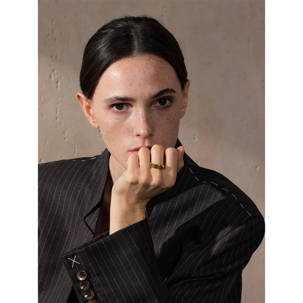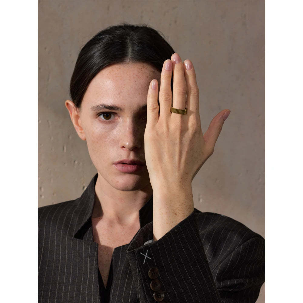 Denna ring med en ojämn yta och en sten i mitten erbjuder en unik och stilfull design. Ringen kommer i 18k pläterat äkta guld eller silver, vilket ger den en lyxig känsla samtidigt som den behåller en modern och rustik charm.