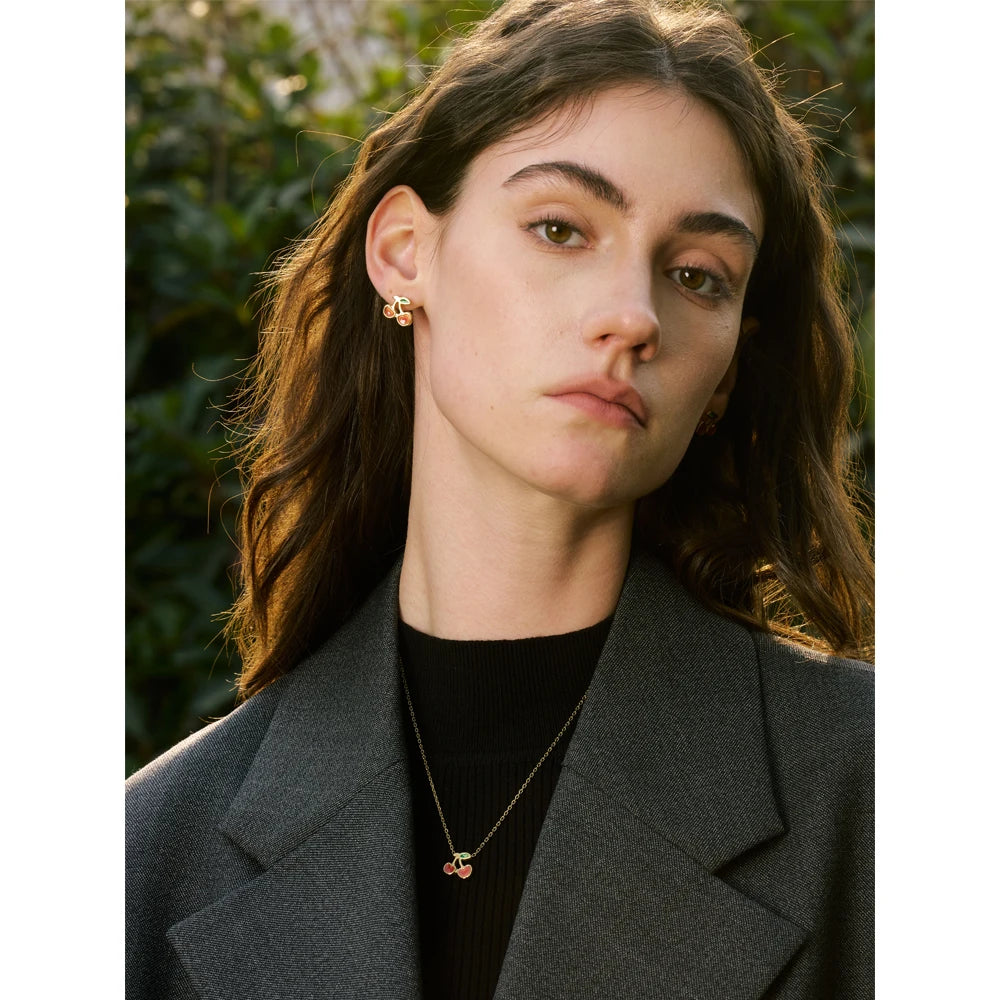 Halsband med körsbär formade av stenar, pläterat i guld. En fräsch och charmig design som ger en lekfull och elegant touch.