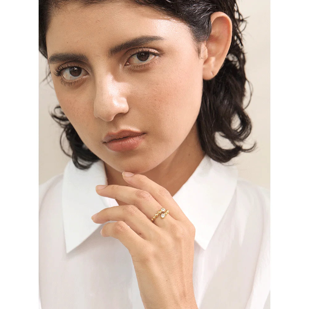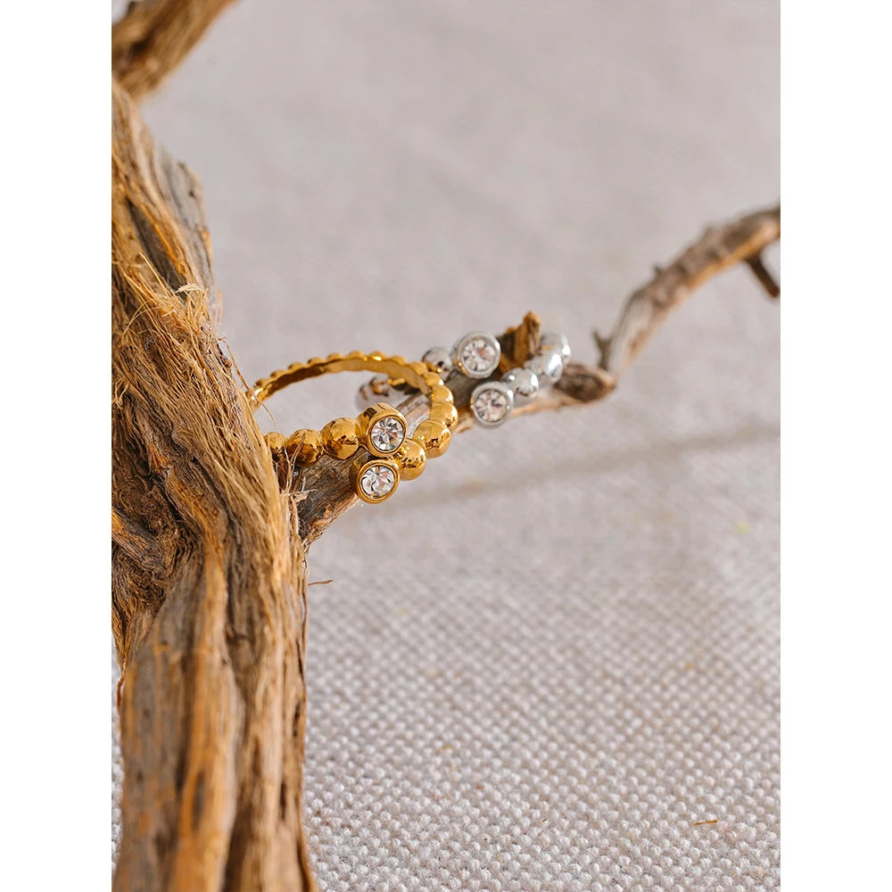 Ring med två gnistrande Zirkonia stenar, finns i både guld och silverplätering. En stilren och elegant detalj som passar alla tillfällen.