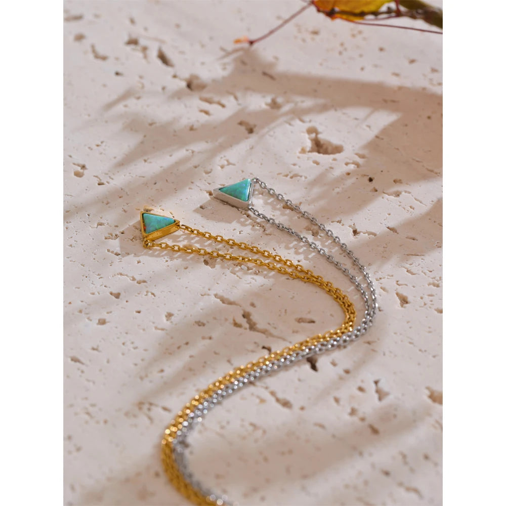 Halsband med hänge i form av en triangel med en vackert blå sten i mitten finns i guld- eller silverplätering en stilren och modern detalj med en färgstark twist