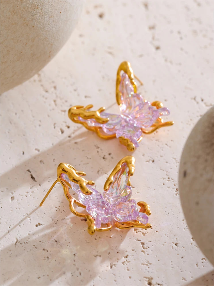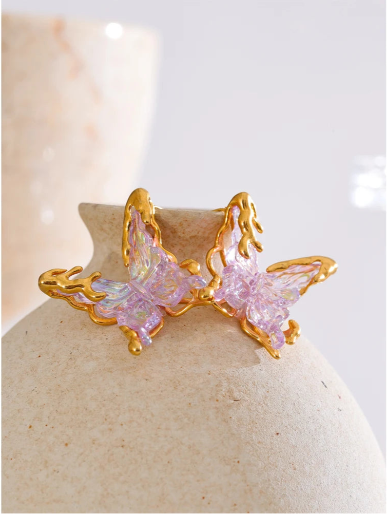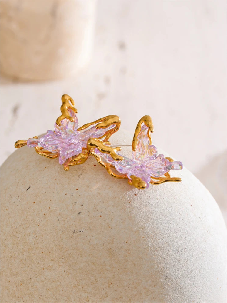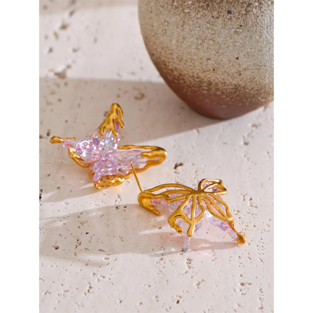 Mycket fina örhängen med en fjäril formad av klart glas som fångar ljuset på ett magiskt sätt. Utsidan är pläterad med äkta 18K guld för en lyxig finish som lyfter hela designen. Ett elegant och lekfullt smycke som passar alla tillfällen.